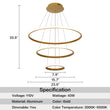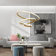 Enhance your space with this elegant 3-ring LED chandelier. Designed for high ceilings, this gold pendant light features dimmable brightness and a remote control for easy customization. Perfect for living rooms, dining areas, and modern interiors, its sleek flush-mount design adds a touch of luxury and sophistication.